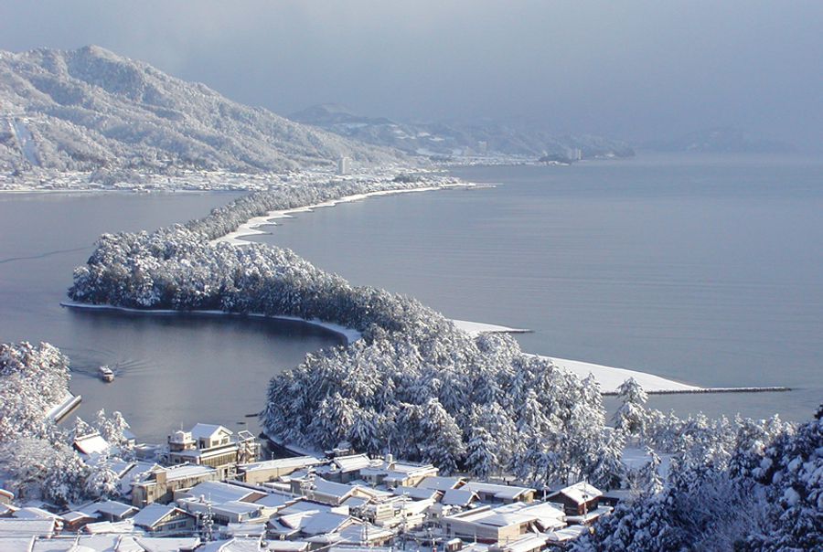 【天橋立】位於京都府北部的風景勝地,在全長約3.6km的沙洲上,種植了約8000株的松樹,排列在沙洲兩旁連綿不斷,與宮城縣的松島、廣島縣的宮島並稱為日本三景。相傳天橋立是神明往來天庭與人間的橋樑,由于其形狀看似天上舞動的橋樑,俯首從雙足之間觀賞之,猶如升天之龍,所以取名為天橋立。