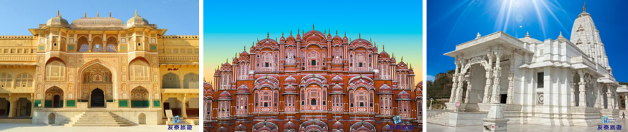 ◎夏恩巴歐麗‧地下宮殿Chand Baori:亦稱《月亮水井》,距今1300年的古宮殿建築模式。因為「拉賈斯坦邦」為印度的沙漠區,所以歷代統治者都會思考如何蓋一座完美的避暑宮殿;而在西元九世紀的時候,執政的「拉基.夏特王」想到了一個特別的好辦法,他命人由地表往下挖掘,約挖了11層樓的深度,造就一座歷史上最華麗的地下宮殿。 ★哈莎特.瑪塔女神廟Harshat Mata Temple:為古印度帶來歡樂與光明的女神,衪降臨在美麗的「夏恩巴歐麗」,留下了祂的神奇足跡,神廟為當地建築的代表。 ★城市宮殿City Palace:是『捷普』唯一不是粉紅色的建築,樓高共七層,裝飾著馬賽克拼鑲圖案和繪畫,宮殿內的皇宮博物館展示古代服飾和器物,當中以兩只純銀打造的巨大銀壺最為特別,據說是君王為了前往倫敦參加「愛德華」王子加冕典禮時,為了沿途能飲用、沐浴恆河聖水而特別訂製的。 ◎風之宮殿Hawa Mahal:建於西元1799年,為一座五層樓式的建築,外觀粉紅色,繪飾白色邊框和圖案,乃是『捷普』主要市標,由953扇窗戶巧妙構成,因為站在宮殿每個角落可感覺有風吹入而稱之,窗戶設計是為了供昔日皇后嬪妃及宮中仕女在此處觀賞外面市集街況。