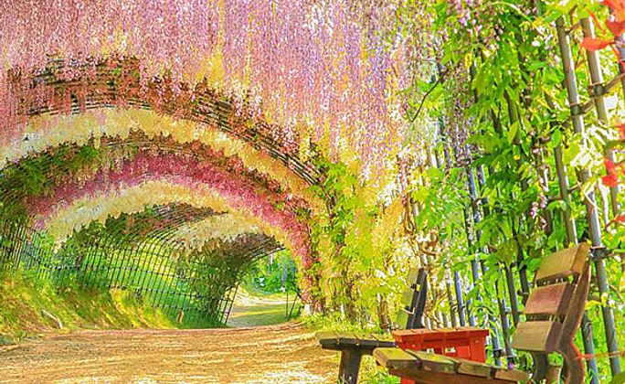 第 6 天 飯店▶浴火重生的百大名城~小倉城&小倉城庭園▶世界最美紫藤隧道~河內藤園▶★唐津城舞鶴公園(紫藤名所:花季時間約四月下旬至五月初)▶御船山樂園~紫藤+杜鵑花▶夜宿嬉野溫泉 河內藤園隧道唐津城舞鶴公園御船山樂園嬉野溫泉 【小倉城&小倉城庭園】位於北九州市小倉城旁邊的日本庭園。這座美麗的庭園,同時再現了江戶時代典型的武家宅邸。園內分為四個區域,其中的「書院區」設有傳統日式書院造風格的木造建築,以書齋為中心,配有茶室與客廳等空間,透過障子與拉門劃分房間,處處展現出日本獨特的美學意識。位於小倉城下的小倉城庭園,原本是小笠原家的下屋敷別邸,歷經復原,重現典型武家書院風格,還有茶室與展覽館,讓人一走進去就能感受到日本傳統文化。【河內藤園】擁有大約3000坪面積,一年中只有春天賞藤季節跟秋天賞楓季節開放。藤花種類共有22種,花期從4月中旬至5月中旬,其中最有名的就是長220公尺,以及長80公尺的兩種不同種類的藤花隧道,當通過藤花隧道以後,映入眼簾的是1000坪左右的巨大藤花花架,一株株藤花從花架上垂下的美麗風景,讓人流連忘返。【唐津城舞鶴公園】如歐洲古堡面山臨海的唐津城位於唐津市滿島山上,是由豐臣秀吉的家臣寺澤廣高於江戶時代所建造完成,從城頂天守閣上眺望左右松原,形狀彷彿鶴展翅高飛,因此別名又稱為舞鶴城。天守閣展示了藩制時代的寶貴武具史料、唐津燒的資料等等考古文獻,天氣晴朗時可從5樓瞭望台鳥瞰遼闊的虹之松原、唐津海灣上的高島。唐津城周邊的舞鶴公園為賞櫻、紫藤花勝地,每年3月份有500多株的吉野櫻齊開,5月份有百年紫藤花一串串垂掛在棚架上,隨風搖曳的景色相當美麗動人。【御船山樂園】佐賀縣武雄市的象徵御船山,山腳西側為武雄領主鍋島茂義費時3年時間所建造的別莊,現為御船山樂園。春天有5千多株的櫻花、20萬多朵的杜鵑花齊開爭艷,以御船山的斷崖為背景,有如中國的山水畫般形成壯麗的景觀。擁有170年歷史的九尺藤,隨風搖曳充滿了和式風情相當淡雅。秋天之時有15萬坪楓紅,從御茶屋可觀賞到一整片楓葉與山、湖間的倒影,為人氣知名景點。御船山樂園一年四季都能夠欣賞到不同的美景,因此前來造訪的遊客絡繹不絕。【嬉野溫泉】嬉野溫泉和武雄溫泉並稱縣內的二大溫泉,已有1,300年歷史,泉水含有豐富碳酸氫鈉,有去除角質層、皮脂及柔滑肌膚的功效,深受女性遊客歡迎。也和島根縣的斐乃上溫泉、栃木縣的喜連川溫泉並稱「日本三大美肌之湯」。