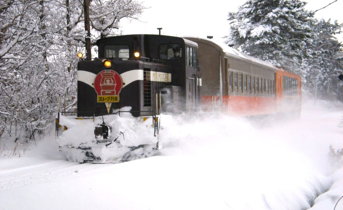 津輕鐵道 ▍冬季限定 ▍暖爐列車冬季限定的「暖爐列車」,設置炭爐的懷舊復古風暖氣列車,行駛在白雪紛飛的津輕平原間,聽著列車內乘客們熱絡的交談,一同靠在燒紅的爐邊取暖,嚼著炭火烤熱的魷魚干,欣賞著車窗外的銀白色世界,感受不同於以往的雪國情懷。