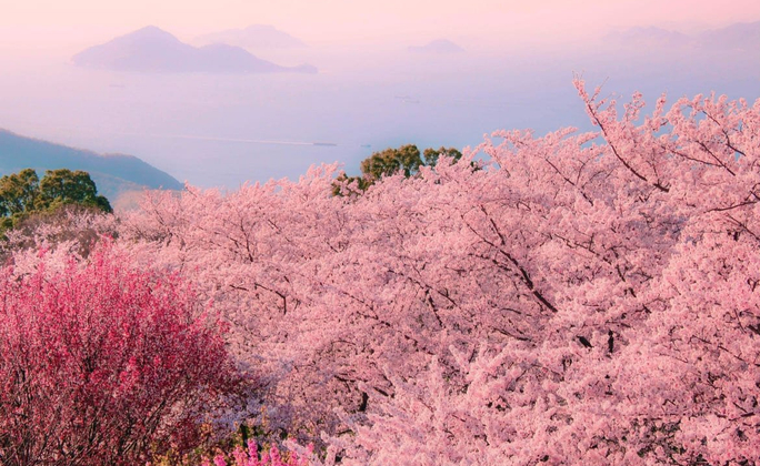 ▍瀨戶內海夢幻賞櫻絕景.紫雲出山由瀨戶內海的島嶼及櫻花交織而成的絕美櫻花名所,被日本雅虎選為「日本櫻花絕景15選」,受到世界注目。春天的時候,1000棵櫻花樹盛開的景色固然是賞心悅目,花瓣散落,為地上鋪上櫻花地毯,同樣是美麗的延續。