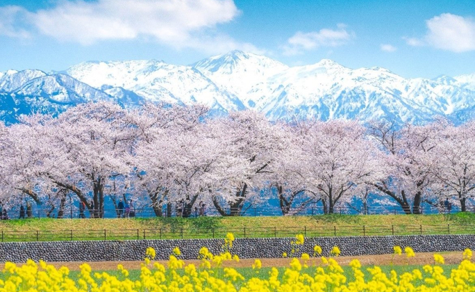 朝日町舟川《春日四重奏》位於富山縣朝日町,沿著位於富山縣朝日町舟川粉嫩的櫻花盛開,以殘雪的北阿爾卑斯山為背景,搭配一整片繽紛花海勾勒春色,拼湊成難得一見的「四重奏」繽紛景色。>