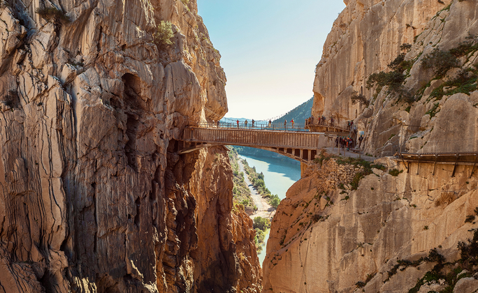 【下車參觀】隆達Ronda 西班牙著名的山城,城鎮位於隆達山地中的深邃峽谷之上,瓜達雷敏河將此座小鎮一切為二,分為新舊城區。由城鎮向下俯瞰,就可以看到連綿至天邊的原野。舊城因為受過摩爾人超過700年的統治,因此充滿了伊斯蘭的摩爾式建築,也融合了文藝復興、巴洛克式的建築,海明威以及許多作家、詩人都曾慕名來訪。此外,這裡也是近代鬥牛術之發源地,西班牙最具歷史的鬥牛場至今仍舊舉辦著熱鬧的鬥牛慶典活動。 【下車參觀】白色懸壁小村塞特尼爾Setenil de las Bodegas 塞特尼爾這個由河谷切割出來的峽谷區小村極為獨特,易於藏匿的顯要地勢加上豐沛水源,讓小村成為阿拉伯摩爾人最後固守的據點之一。現今所看到的岩石住宅建於15世紀,人們遷居到這裡時,看到這巨石感覺很穩固,直接拿來當住宅,岩石成了現成的屋頂與牆壁,在峽谷中落地生根,數個世紀以來在巨石守護下,成了一道獨特的風景線。 【門票安排】國王之路CAMINITO del REY 西班牙國王之路棧道,修築於1905年,是為了讓居民運輸物資和工人修築水壩可以方便往返,全長7公里,後由於棧道年久失修,發生多起意外事故,當地政府關閉了長達15年的時間;馬拉加政府耗費550萬歐元進行全面修建,終於在2015年3月,又重新對外開放。走在整修後的步道上,不用再像以前那樣提心吊膽,可以放鬆精神、好好欣賞這一路絕壁千仞的自然美景! 行程備註: 1. 國王之路(實際步行時間約2~2.5小時,步道基本平坦好走,但如有懼高症者請勿參加,可於遊客中心或餐廳休憩等待團體,因團體門票須提前預訂,恕無法退費)。 2. 如遇園區訂滿或關閉等因素,則改至安特克拉的托爾卡爾山自然保護區El Paraje Natural Torcal de Antequera參觀。