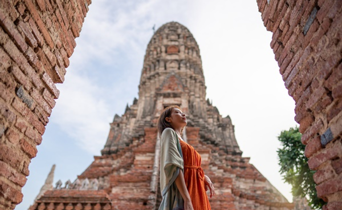 大城府的瑪哈泰寺(Wat Mahathat),興建於1374年(素可泰王朝時期),是大城府最早建造的高棉佛塔之一。共有198座佛塔,1991年列入世界遺產的「阿瑜陀耶古城」項目之一。考古學家推論為當年素可泰王朝(西元1238年-1438年)的行政與信仰中心,素可泰王朝為泰族的第一個帝國,佛像雖然受到錫蘭與高棉的佛教藝術影響,但建造出「行走佛」佛像造形獨樹一格,體現佛陀慈悲與沈靜的力量,呈現出獨特的佛教美學。
