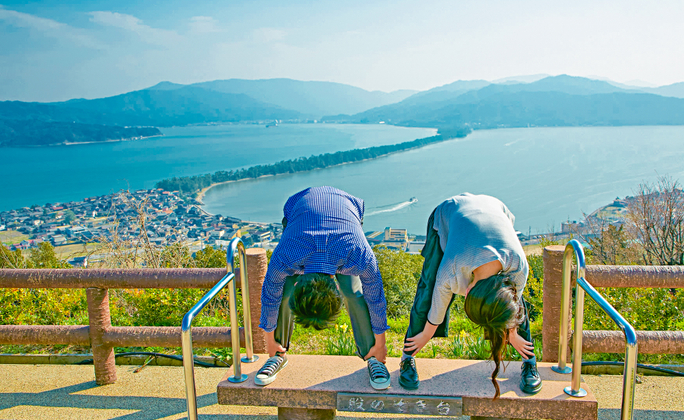 天橋立位京都府北部宮津灣西側,地屬丹後天橋立大江山國立公園的範圍,天橋立長3.6公里的沙洲,直伸出宮津灣,有如天上一道彩虹橋,在山頂上的傘松公園彎下腰從雙腿跨股望去,彷彿神話中浮在天上牛郎織女相會的七夕橋,所以得名為天橋立。天橋立被日本美譽為日本三景之一,與仙台的松島、廣島的宮島並列。傘松公園為一座300度的景觀公園,可眺望鳥瞰大江山連峰至阿蘇海、宮津灣、若狹灣與天橋立的尾部,特別安排搭乘纜車俯首觀賞「升天之龍」奇妙景象。