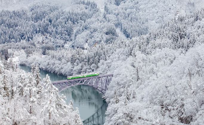 只見線被譽為是日本最夢幻的祕境鐵道,曾獲得日本經濟新聞「紅葉美景鐵道」票選第一名、「最美雪景地方鐵道」票選第三名。全線最知名的景點莫過於「只見川第一橋樑」,凡造訪過的遊客,均難以忘卻那秘境之美。
