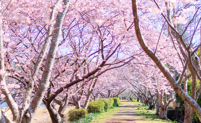 日本最早的櫻花約在每年2月上旬至3月上旬綻放,花期約為一個月。粉嫩的顏色加上較大的花蕊是其特色,在開花後的兩星期長出新綠的嫩葉也很漂亮。除了粉嫩的櫻花可欣賞之外,還有滿開的金黃油菜花,金黃與粉色交織的風景更為迷人。在溫柔的光線下,隨著微風輕擺的油菜花與枝上的河津櫻,令人陶醉。