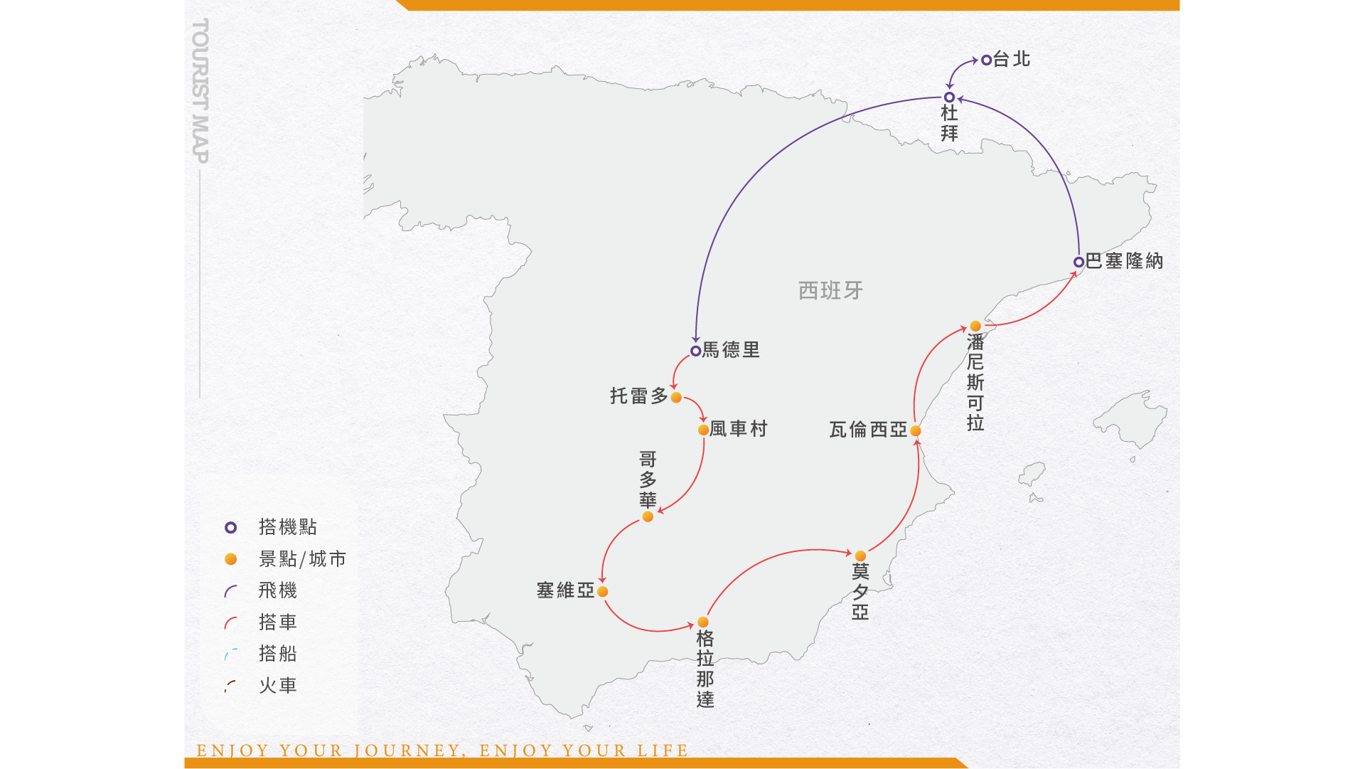 今日準備好行李及裝滿希望的行囊,集合於桃園國際機場,專人協辦出境手續後,搭乘豪華客機飛往陽光國度-西班牙,一趟浪漫熱情的饗宴也隨之開始。在滿懷憧憬與期待下,我們將發現更真實的西班牙。《參團貴賓提醒說明》:因歐洲各大景點門票對於團體預約參觀限制日趨嚴格,如團體可預約參觀數量額滿,則可能改為個人票自由參觀或替代景點參觀方案,因此狀況難以避免,如貴賓無法接受,請勿參加團體旅遊行程,以免打擾遊興。