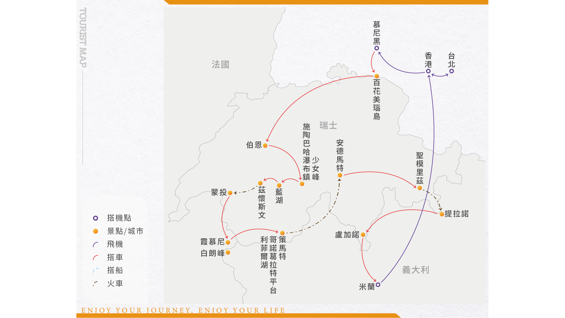 伯連那景觀列車【加贈伯連那列車證書】 伯連那的Rhaetian鐵路在2008年入選世界遺產。首先來到最知名的迴圈石拱橋Loop Viaduct,這是世界上獨一無二的開放型360度迴圈拱橋,共9個弧拱,中間還有三個現代雕塑,隨後一路爬升沿途行經白湖Lago Biancom與高山湖泊發電水壩,三道白雪壯觀的冰河就在湖對面的山壁上,此時已是全程最高點海拔2033公尺,連續的U-turn的迴旋下降,以最大坡度70度緩降之後來到聖摩里茲完成一次精彩的冰河與湖泊的美麗邂逅。乘坐在舒適的座椅上,放鬆自己,好好享受火車一路向您展示Bernina山谷的森林景色與高山的氣勢。(因伯連納列車常遇不定期維修,若遇伯連納列車訂滿,或停駛,或維修,則以瑞士國鐵行駛相同路線作替代,並退費20瑞郎/人,敬請見諒)盧加諾 瑞士南部與義大利交界處,Ticino州的首府,盧加諾,前往盧加諾必須穿越阿爾卑斯山脈,一出隧道後,眼前迎面而來的棕櫚樹及熱情溫暖的陽光,絕對讓您感到驚訝,這個雖然處於瑞士,但從天氣、建築、問後方式都確展現出濃濃熱情的義大利味的城市,讓您不禁狐疑─這裡真的是瑞士嗎???盧加諾湖也被稱“Ceresio”, 街上點綴著歷史建築和馬里奧·博塔設計的現代建築,也許是因在地理上靠近義大利的米蘭,時尚氣息很強,是個購物天堂。 【門 票】:伯連納景觀列車