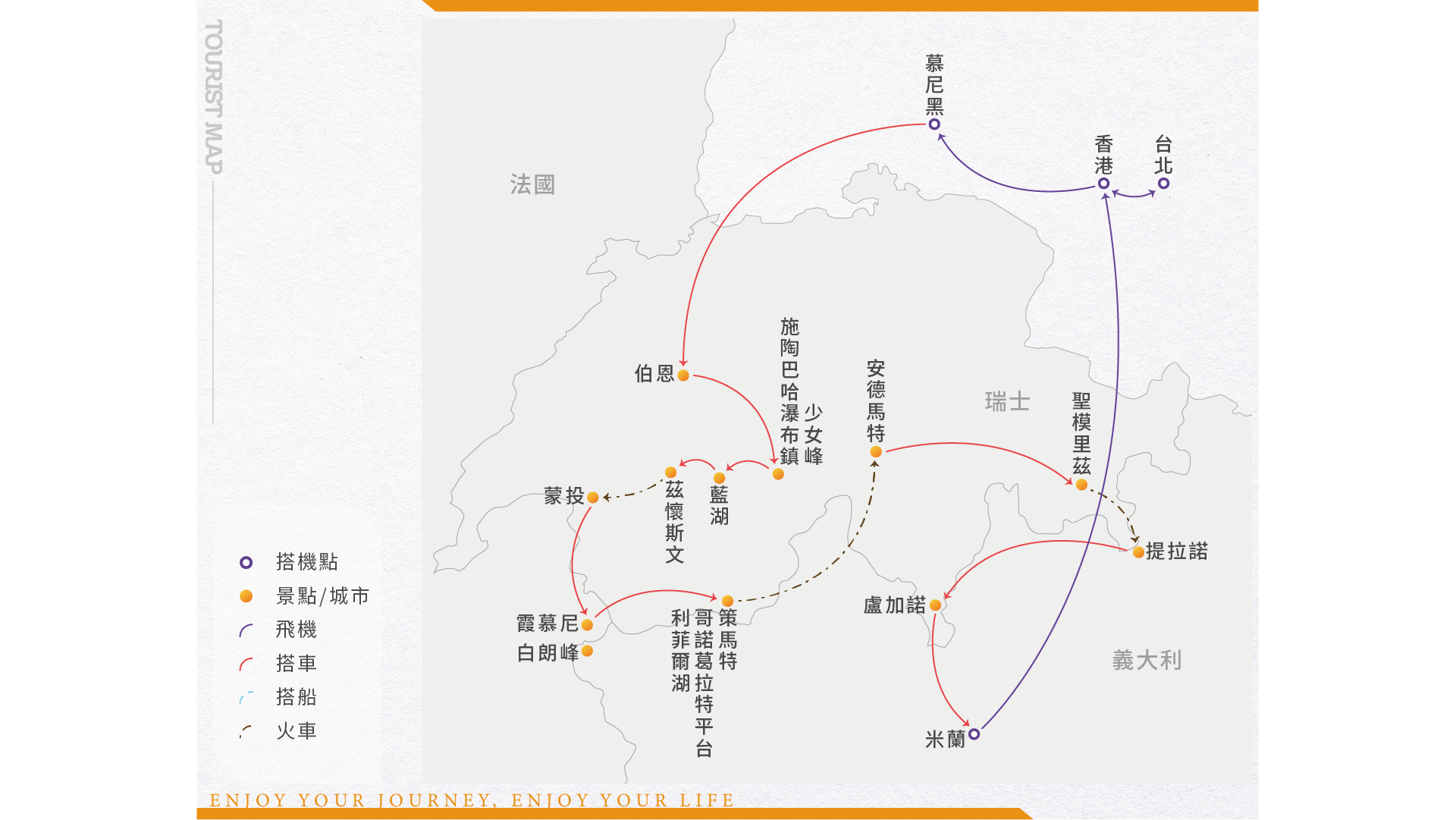 【貼心提醒 - 今晚請攜帶過夜包】位於馬特洪峰山腳的策馬特,一年四季有著絡繹不絶的遊客。為了當地的環保,渡假勝地禁止車輛進入,遊覽車皆須停在城外再換電動車,大型行李無法隨身,所以各位貴賓則需準備過夜包。今日早餐後特別為您安排 今晚我們入住馬特宏峰山腳的策馬特,大街上都是商店、餐廳、旅館,迎接每一位前來朝聖的遊子,晚餐後,漫步於此寧靜的度假山城中,夕陽裡的馬特洪峰獨具風情。蒙特維爾冰河 蒙特維爾(Mont-envers)原文的意思是「山的背面」,也就是指白朗峰背面的冰河區,在1741年兩個英國人首度發現後,卻成為霞慕尼最受歡迎的觀光景點之一。 終點車站位於冰河旁的山上,這條全長7公里、面積40平方公里、深200公尺的冰河,列名歐洲第3大,它由高聳入天的阿爾卑斯群山中穿過,非常壯觀。 這裡的旅途亦是非常有趣的,搭乘紅色的冰河列車將從霞慕尼開往海拔1913公尺的冰河區,沿途盡是森林高山美景,讓人心情愉悅。抵達山頂後,轉搭一段冰河纜車,您可更近距離的觀賞此歐洲第三大冰河奇景,若您體力許可,更可來一段冰河峽谷健行,徒步進入萬年冰洞之內。冰洞是一座天然的冰藍色的洞穴,如此晶瑩剔透,越往深處探入,隨著光影,色澤則不斷變化,穿梭其中,宛如置身仙境。健行步道須當天天候狀況為主,若遇山地積雪或下雨,有安全疑慮,不適合健行活動,則會取消健行活動。若天氣許可,我們再隨著領隊的步伐,來趟健行之旅。敬請悉知見諒策馬特 屬於「阿爾卑斯山精華區」聯盟成員之一的策馬特位於馬特洪峰山腳下,海拔1,620公尺的策馬特是瑞士最南端的度假聖地,這裡的空氣清新、純淨,週邊聳立著38座超過4000公尺的山峰,許多人對瑞士的第一印象,就是擁有挑望馬特洪峰絕佳視野的策馬特,因此緣故此第也自然成為瑞士瓦萊州最俱人氣的阿爾卑斯山城。 【下車參觀】:策馬特度假小鎮【門 票】:冰河火車+峽谷健行之旅 (註:冰原峽谷健行,需視當天山頂天氣狀況而定,如遇天候狀況不佳或其餘人力無法抗拒之因素,導致無法健行,因為是包含在火車套票,故無法退費,敬請見諒。)