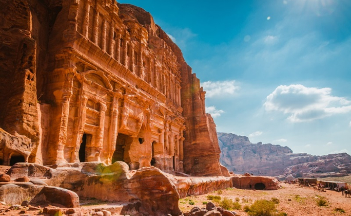 位於約旦南部的佩特拉,與中國長城、馬丘比丘、泰姬瑪哈陵等遺跡並列世界新七大奇景。1985年由聯合國教科文組織UNESCO登錄為世界遺產。佩特拉一詞為希臘文石頭之意,此城即是由石頭中鑿出,工程偉大而浪漫。古城位於約旦南部的摩西谷地 (Valley of Moses),整座古城矗立於海拔約1,000公尺的深山峽谷中,岩壁隨著光影變幻出神秘色彩,被聯合國列為人類遺產保護古蹟。 佩特拉是希羅時期由當地游牧民族納巴坦恩人所建於摩西峽谷的城市,相當富裕。但在十字軍以後至19 世紀初之間完全被世人遺忘。直到1812年才又被發掘,爾後名列於1999年美國《國家地理旅人雜誌》選出的五十個旅人此生必遊之地。步行或騎馬抵達蛇道入口 (馬夫服務費單趟5美金),彷彿是印地安那瓊斯,下馬後徒步通過峽谷,半掩在峽谷窄道盡頭的艾爾卡茲尼神殿讓人目瞪口呆,兩千多年前雕刻的玫瑰色美麗宮殿,由巨大的玫瑰色岩石雕成,有著四角形大廳廣場、宮殿及神殿墓穴,因該城一帶全是紅色砂岩,故有「紅色玫瑰的石頭城」之稱。