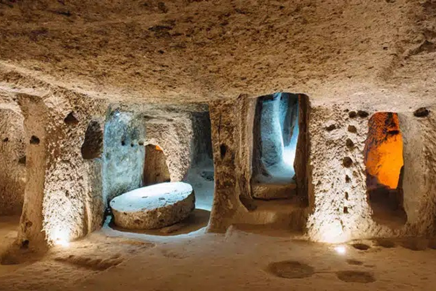 由柔軟的凝灰岩層雕鑿而成,深入地下多層空間。早期基督徒為躲避戰亂與迫害,在此建構居住室、儲藏室、廚房、酒窖與通風井,形成自給自足的地下生活網絡。城內通道狹窄蜿蜒,石門滾輪設計巧妙,可在危急時迅速封閉入口。走入其中彷彿穿越千年,感受古人為求生存所展現的智慧與堅韌。這座神秘地下城揭開卡帕多奇亞文明的另一面,令人嘆為觀止。