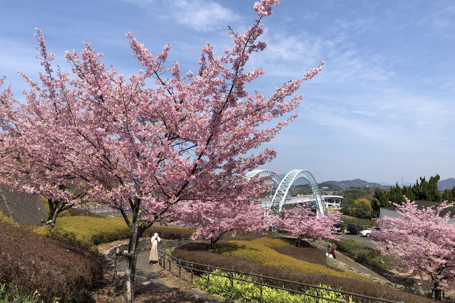 【西海橋公園】從西海橋公園內的展望台可遠眺新舊兩座西海橋並列的風景,橋下則是日本數一數二的急潮。西海橋公園面朝著大村灣的出入口針尾海峽,有染井吉野櫻和大島櫻,到了春季會一齊盛開。此外,擁有日本三大急流之一的針尾海峽海面上,會出現多個漩渦,在每年春秋潮差最大的時候,可以 欣賞到壯觀的漩渦景象。當1000多株櫻花盡情綻放時,櫻花與漩渦相呼應,構成極具特色的美景。