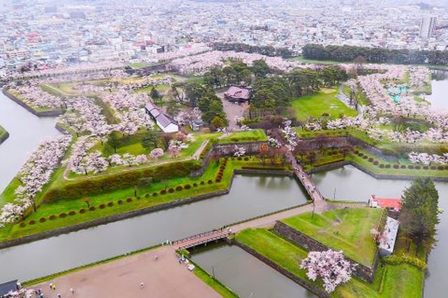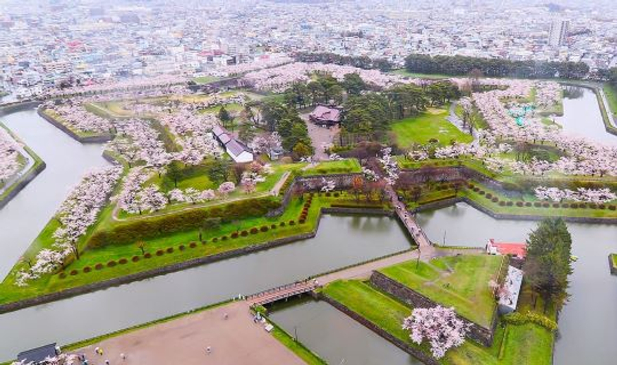 日本江戶時代末期由武田斐三郎所建的一座星形要塞,也是日本的第一個西式城廓。在1868年成為日本舊幕府和新政府最後內戰〝箱館戰爭〞的舞台。1914年改建為五稜郭公園,並被日本政府指定為特別史跡,現今護城河沿岸種植了約1600株櫻花樹,每當春暖花開,一株株娟粉的櫻花,日夜都溫柔地陪伴著威武堡壘。