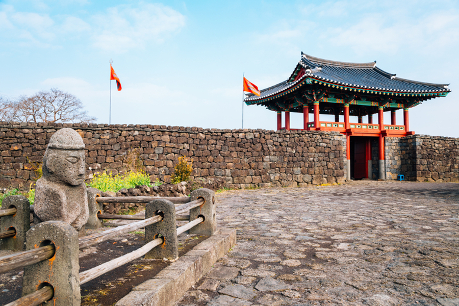 位於漢拏山麓,是完全保存了韓國傳統的一處民俗村。這裡有許多文化遺産,很好地保留了古代村莊的原貌,因而被指定爲民俗村並受到保護。這裡至今仍保留著民屋、鄉校、古代官公署、石神像、石磨坊、城址、碑石等有形文化遺産及民歌、民俗遊戲、鄉土食品、民間工藝、濟州方言等無形文化遺産。村子中間幾百年樹齡的櫸樹、樸樹已被指定爲自然保護對象。此外這裡還可以接觸到韓國獨特的土種文化,十分受外國人的青睞。城邑民俗村位於濟州島上,因而也完全反映了濟州島獨特的居住文化。