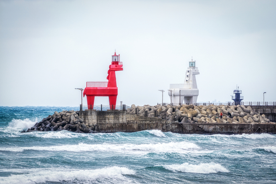 濟州島IG打卡熱點,韓綜《我們結婚了-國際版》拍攝地。梨湖海水浴場是最靠近濟州市區的海水浴場,設備完善且沙灘坡度不高相對安全,每到夏天就有許多避暑的遊客前往,海邊還有一片松樹林適合野營。兩座特色燈塔,一紅一白的小馬樣子,非常吸睛。