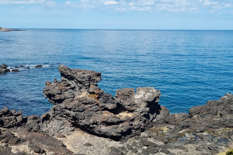 漢潭海邊(한담해변)位於濟州的西北部,沿途海岸線的涯月海邊公路更被譽為濟州海岸公路中風景最美的地段,可以欣賞一望無際的大海和形狀奇特的黑礁石!漢潭海邊沿途有不少咖啡廳和民宿都坐落在這段海岸線,細軟的白沙灘旁是黑色的火山熔岩海岸線,海水既藍又綠,肉眼所見比起照片來得更夢幻,整片海域乾淨到漁夫徒手下海就能帶活跳跳的海鮮上岸呢!