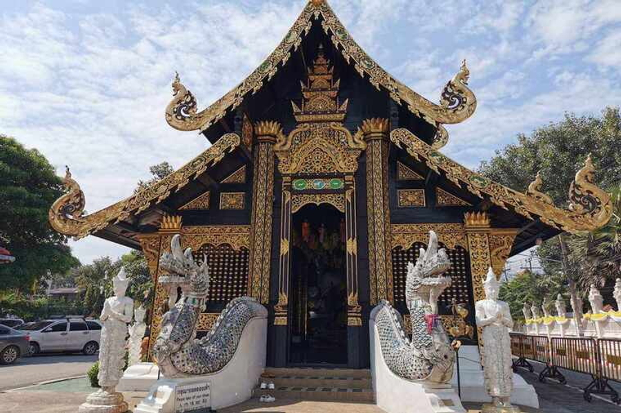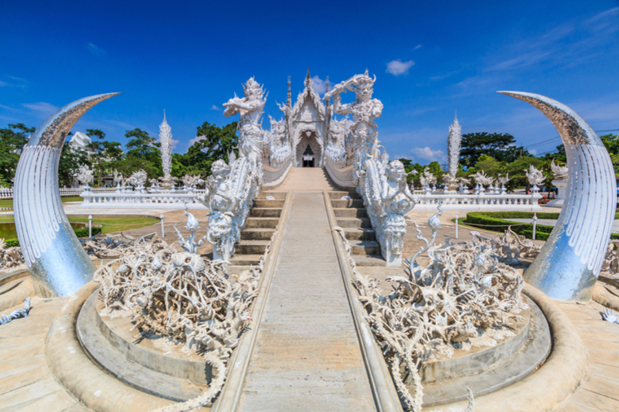 由泰國知名藝術家 Chalermchai Kositpipat 精心設計,以純白色主體搭配鏡面馬賽克象徵佛教的純潔與覺悟。整座廟宇宛如雪雕藝術般閃耀,結合現代卡通、電影角色與佛教哲理,形成獨一無二的視覺震撼。陽光灑落時,白廟反射出夢幻光芒,被譽為「泰北最具靈魂的藝術奇蹟」。
