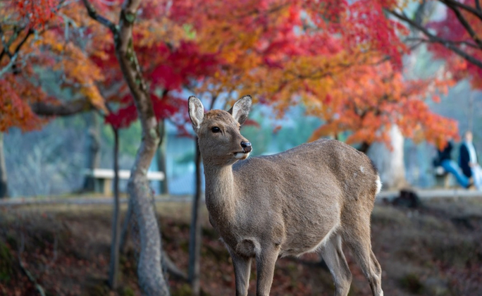 這座公園不僅是奈良最具代表性的景點之一,更是賞楓的絕佳地點。每年10月下旬至11月上旬,公園內的楓葉逐漸轉紅,與金黃色的銀杏交織出一幅絕美的秋日畫卷。最特別的是,這裡的梅花鹿悠閒地漫步在紅葉之間,形成獨一無二的景色,讓人彷彿走進童話世界。