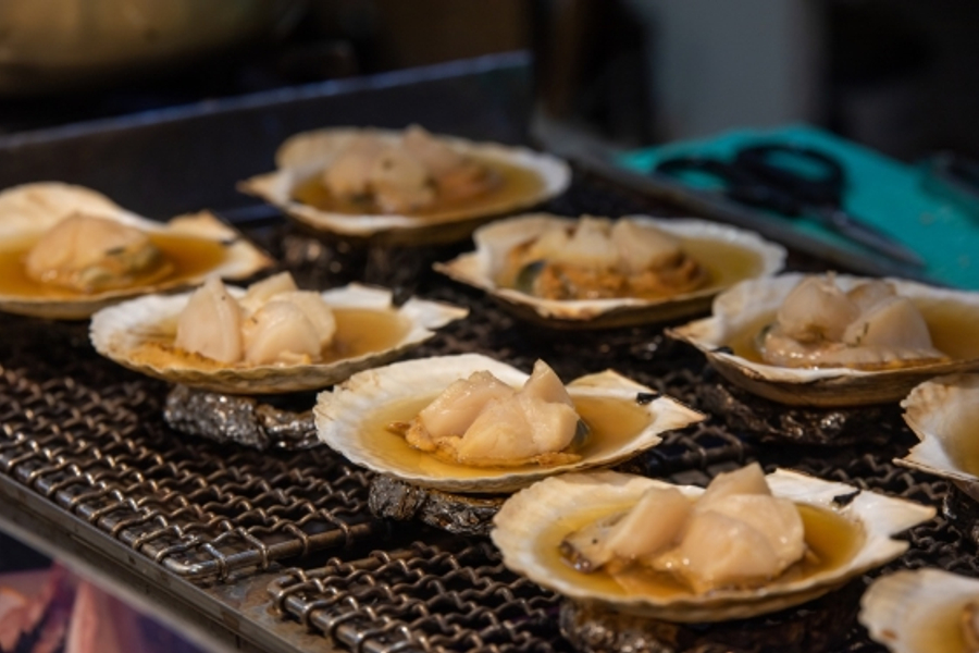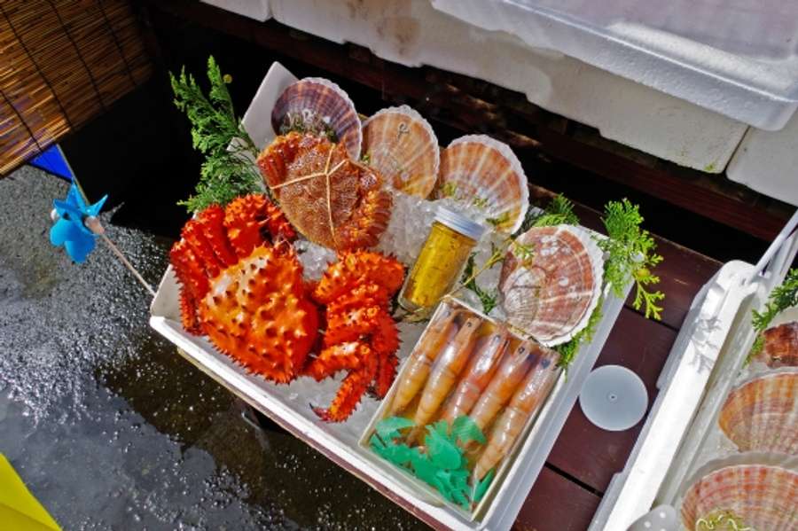 【函館朝市】各式各樣的海鮮目不睱給。美食街裡的餐廳門口,擺著數不清的的餐點模型樣品,令人垂涎,也可以自費品嚐海膽蓋飯、魚卵蓋飯、螃蟹鍋物..等等。