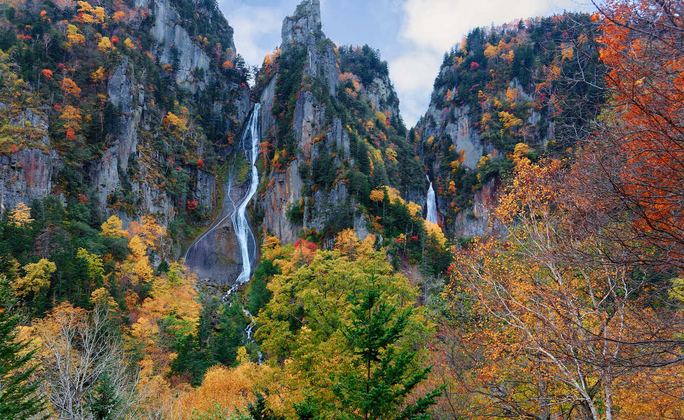 層雲峽谷中最著名,也被比喻為一對戀人的別名男瀧的『流星瀑布』,彷彿一捆粗線軸般從80公尺高的斷崖急速滾下,頗具一番豪情;而像幾條白絲線的『銀河瀑布』,則慢條斯理地從120公尺高的斷崖緩緩流下,難怪另稱女瀧,名列日本瀑布百選的這兩個瀑布,對稱地鑲嵌在谷壁上,觀望比較起來格外有趣,也是遊客合影留念的好所在。