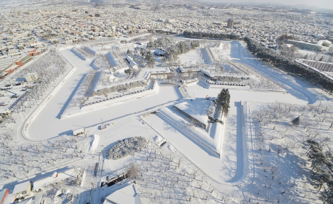 來到函館的地標-五稜郭公園,五稜郭以造型非常獨特的星狀碉堡聞名,明治維新時期支持幕府人士,抵抗天皇軍隊最後一站(箱館戰爭1868~1869年)的發生地點,因此在日本近代史中佔有重要地位。