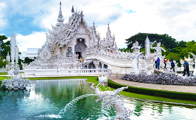 ※為了旅客安全,進入洞穴需配載頭燈帽,請務必配合。 【龍坤藝術廟(又名白廟)】我們口中的白廟其實官方名稱是龍昆寺(Wat Rong Khun),泰國人稱作靈光寺或是白龍寺,因為所有建築都擁有純白造型外觀,也被國外旅客稱作白廟(White Temple)。清萊白廟是由藝術家許龍材設計,1998年開始建造,2014年曾歷經地震受到破壞,直到現在也還在擴增當中,查資料時發現最終預計會有九座建築坐落在此處。純淨建築陽光灑落之下閃爍著耀眼光芒,親眼見到實在震撼極了!網路上最知名的照片就是白廟前方這象徵著通往天堂的橋樑,兩旁地底遍佈著地獄之手,密密麻麻數量眾多,傳說過橋時不能停留也不能回頭,才能走過放棄誘惑與貪婪迎向光明。