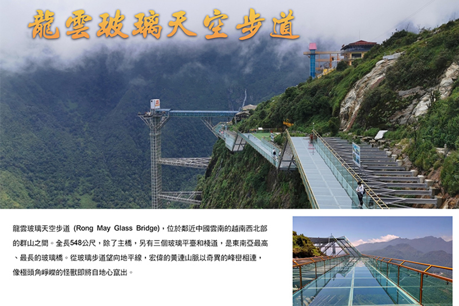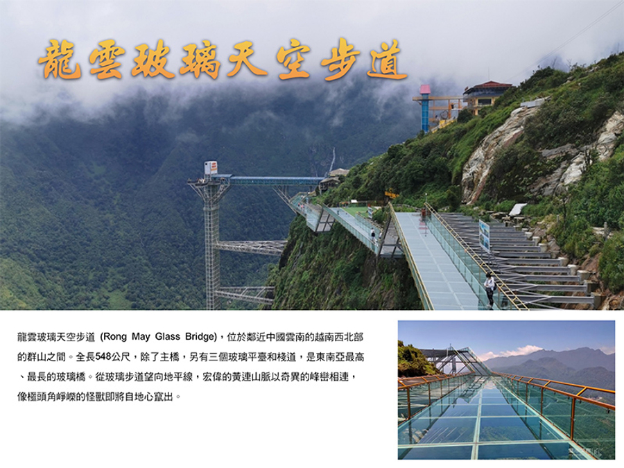 最後也是最具挑戰性的拍照點就是「死亡鞦韆」。這個鞦韆設置在懸崖邊上,專為喜歡刺激的旅人打造。如果你不怕高,那麼站上這座鞦韆拍照,絕對能拍出與眾不同的美照! 【龍雲玻璃天空步道】龍雲玻璃天空步道~是目前東南亞最高最長的玻璃橋,距離沙壩是種僅 16 公里,建造在越南西北方雄偉的群峰之間,548 米的玻璃橋,懸掛在海拔 2000 多米的高空,遠看就像一座伸展台般往天空延伸而去。乘坐透明戶外景觀電梯,延著懸崖峭壁扶搖直上 300 米登頂,步入玻璃橋上放眼望去,遼闊的視野與壯麗山巒景致迎面而來,遠眺氣勢磅礡的雲海,俯視山谷萬丈深淵,一覽玻璃步道下方山谷的壯麗景