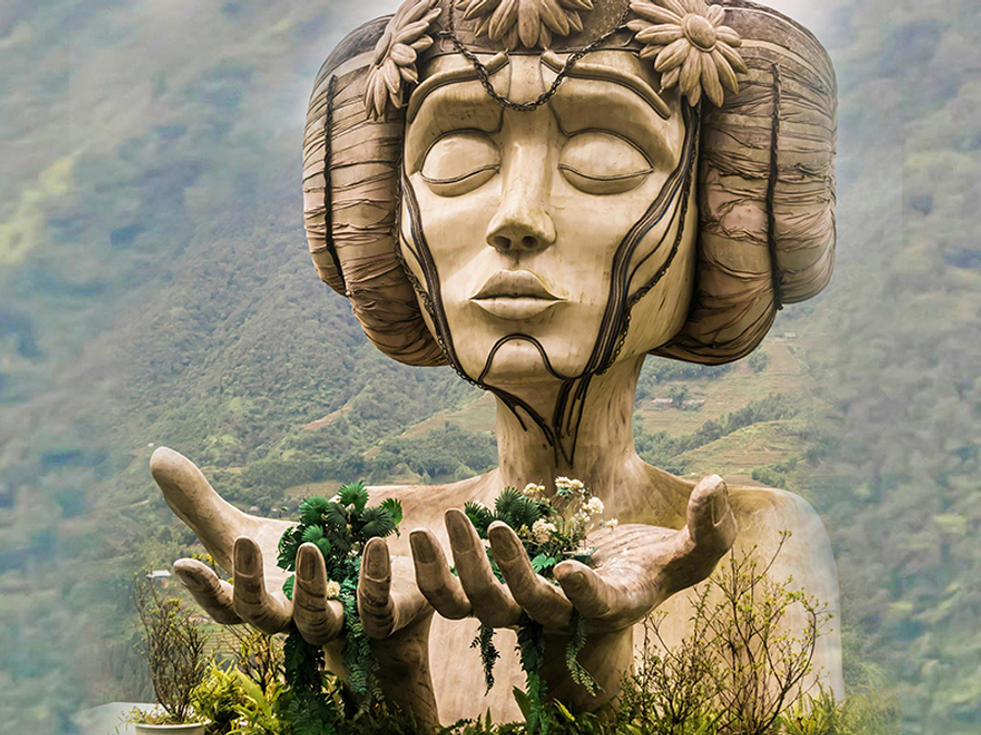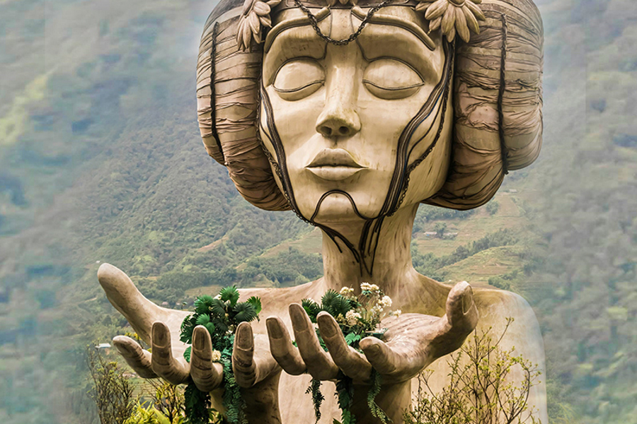 一到 Moana Sapa,絕對不能錯過的就是巨型 Moana 女神雕像。這座高達 6 公尺的雕像展現出一位閉著眼、黑髮飄逸、雙手向上舉起的女性形象,如置身天際之中,為許多藝術作品帶來靈感。雕像下方地板以透明玻璃磚鋪設,猶如鏡面一般反射出雕像的壯觀景象,拍照效果極為震撼。