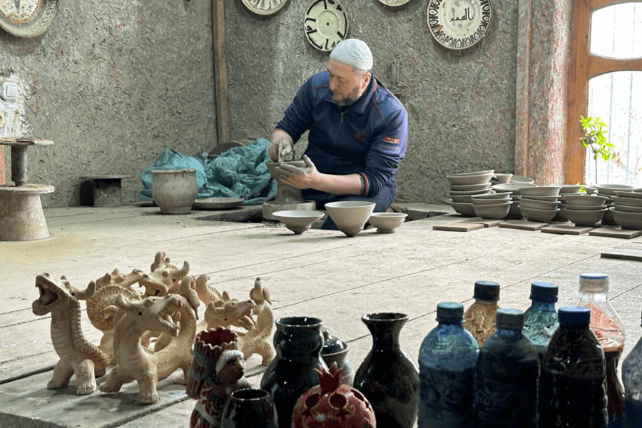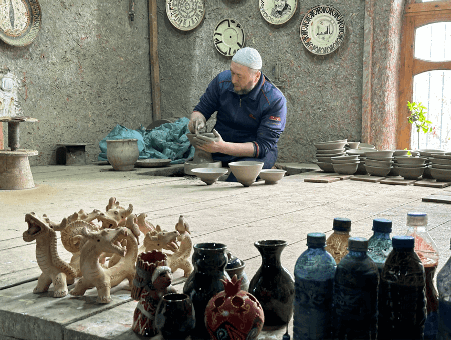 【吉杜萬Gijduvon陶瓷工坊**特別安排陶瓷DIY體驗】在這裡參觀傳統的陶瓷繪畫技術,透過陶瓷工藝了解中亞文化。吉杜萬是烏茲別克斯坦的一個小鎮,以其傳統陶瓷工藝而聞名。這座鎮位於布哈拉省,擁有悠久的歷史,據說其陶瓷技藝已有超過六百年的傳承。這裡的居民約為2萬人,工匠以製作色彩斑斕的陶器而聞名,吸引了眾多藝術愛好者和旅客。吉杜萬的陶藝品常以獨特的藍色和綠色釉面著稱,這些作品不僅是日常生活用品,還是藝術品,展現了當地的文化特色。每年,鎮內會舉辦陶藝節,讓遊客能親自體驗製作陶器的過程。