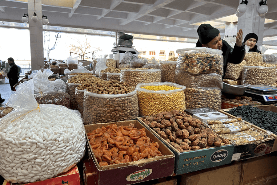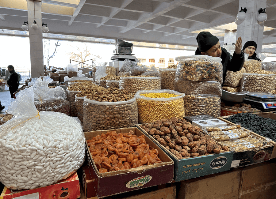 【圓頂市集恰爾蘇巴札Chorsu Bazaar】老城區以圓頂市集為中心,擁有巨大綠色圓頂的市集中販售各種雜貨、乾果與香料,構成了塔什干市民日常生活的片段。