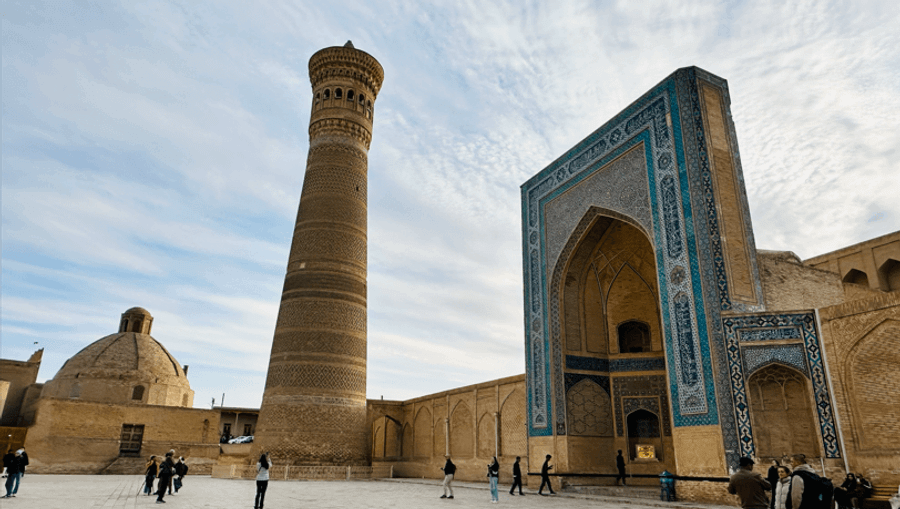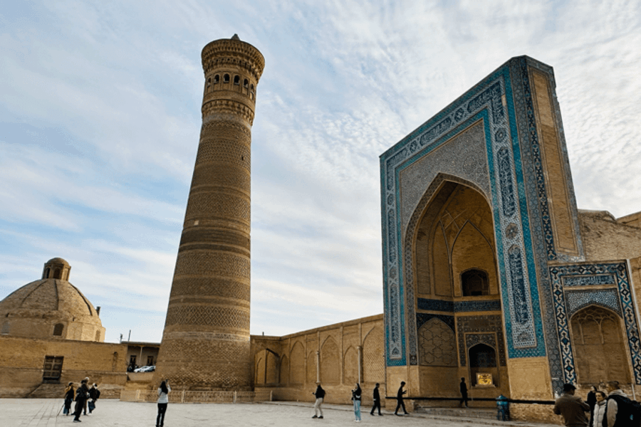 【卡龍清真寺建築群Minorai kalon】建於16世紀的清真寺,裝飾面由磨光塗釉的磚製成,類似馬賽克,十分精美。宣禮塔為巨大錐形細腳到頂部的圓筒形。是布哈拉最醒目的地標建築,是唯一讓草原雄主成吉思汗低頭敬畏的高塔。
