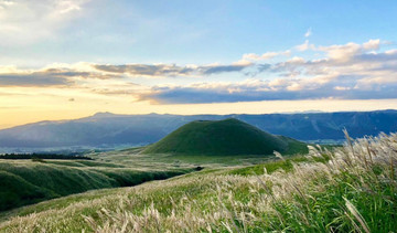 阿蘇米塚可愛逗趣的形狀,看來像是覆倒於大地上的一顆布丁,非常的卡通。米塚的由來據傳是當地的守護神「健磐龍命」,用豐收的米堆積而成,故名「米塚」。 由於附近並沒有巴士站牌停留,只能搭車經過十感受這渾成天然的景觀。