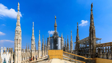 踩著教堂的屋脊繼續向上來到樓頂,這裡的景象比你在下面仰望還要震撼。樓頂太有特色了,這裡看到的景觀足以作為米蘭大教堂的象徵。在樓頂,讓你暈眩的不僅是米蘭城的美景,還有那樓頂135個美麗的石筍狀塔尖,它們在你周圍放佛築起了一個童話世界。而塔尖上的雕像都是與真人大小一樣,讓你不禁感歎米蘭大教堂就是人類建築史上的瑰寶。