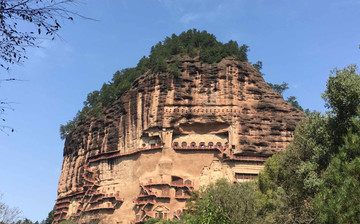 到達麥積山底後便可看到眼前的孤山一整面巖壁全部裸露在外,除此之外周圍隨處都是綠意盎然,景色秀麗。而裸露的這一面巖壁上則修築了一層層的懸空棧道,懸空棧道非常險要,最高處有六百多公尺,在棧道之間開鑿了多座大大小小的洞窟和佛像,在山下拍照非常壯觀。