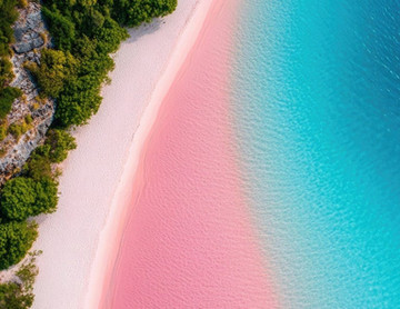 成因為印尼國寶--紅珊瑚。海底大量的紅色珊瑚被海水沖碎後變成細小的粉末,與岸上細白的沙子融為一體後,便形成了這浪漫的粉紅色沙灘